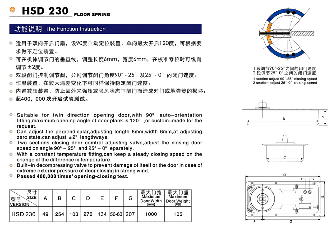 主要特点:   适用于双向开启门扇,设90度自动定位装置,单向最大开启120度,可根据要求做不定位装置。